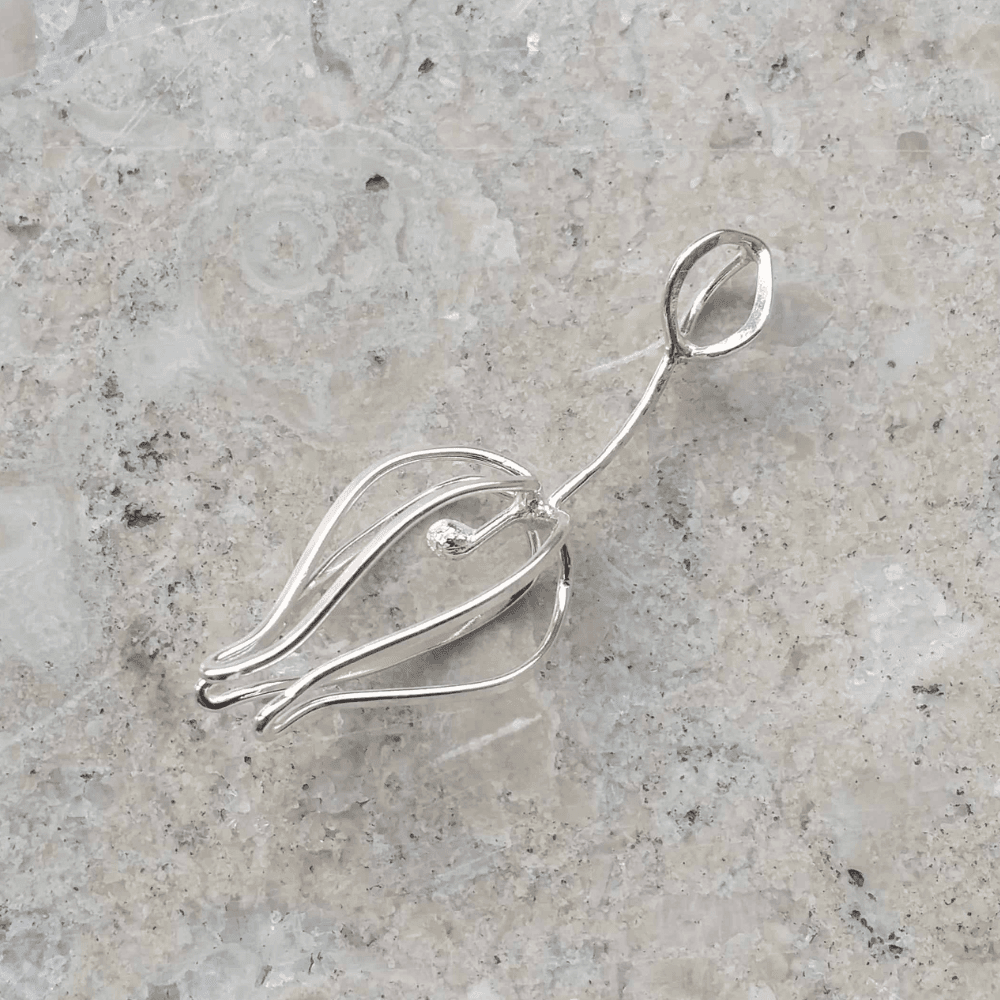 Organiskt formad blomma, handsmidd av en tråd i återvunnen ädelmetall för att förstärka känslan av att allt hänger samman. Blomman är symbolen för livskraft, och skönhet, men också förgänglighet. Denna blomma vill mjukt påminna dig om att vara i nuet, men kommer inte att vissna. Har du en speciell händelse blomman blir förknippad till, kommer den att påminna dig om den.