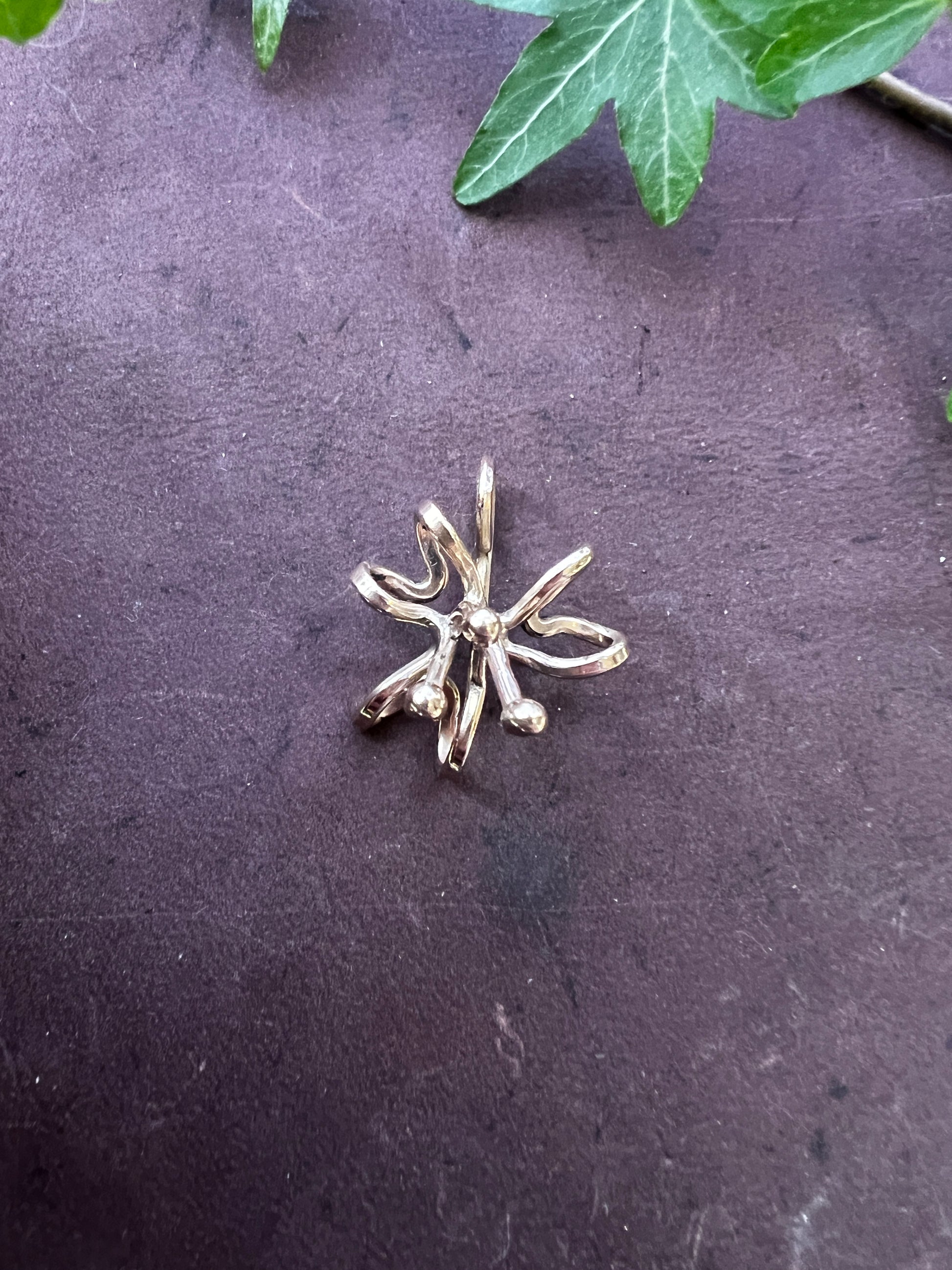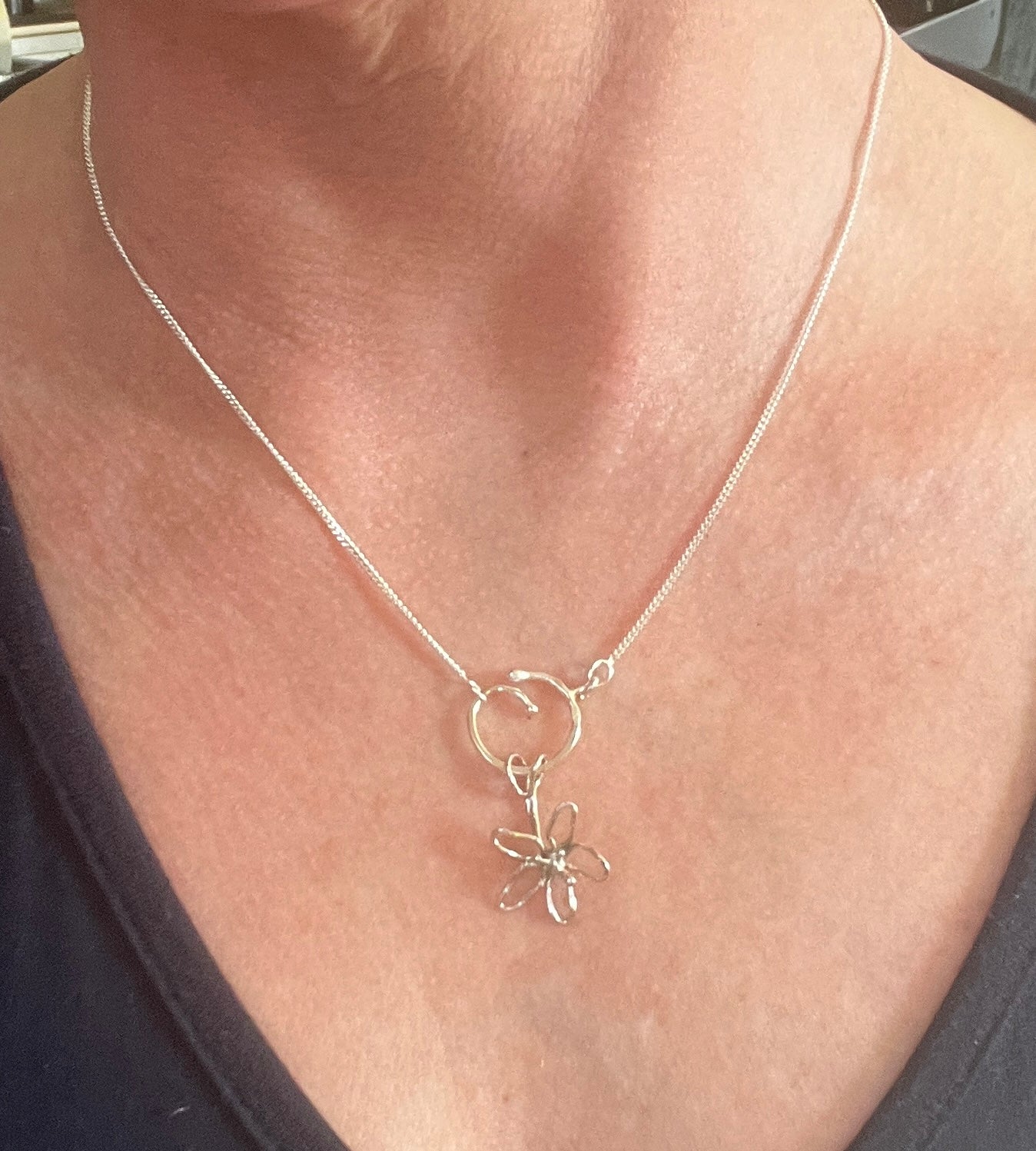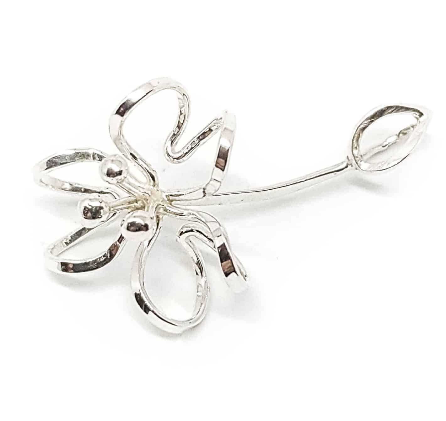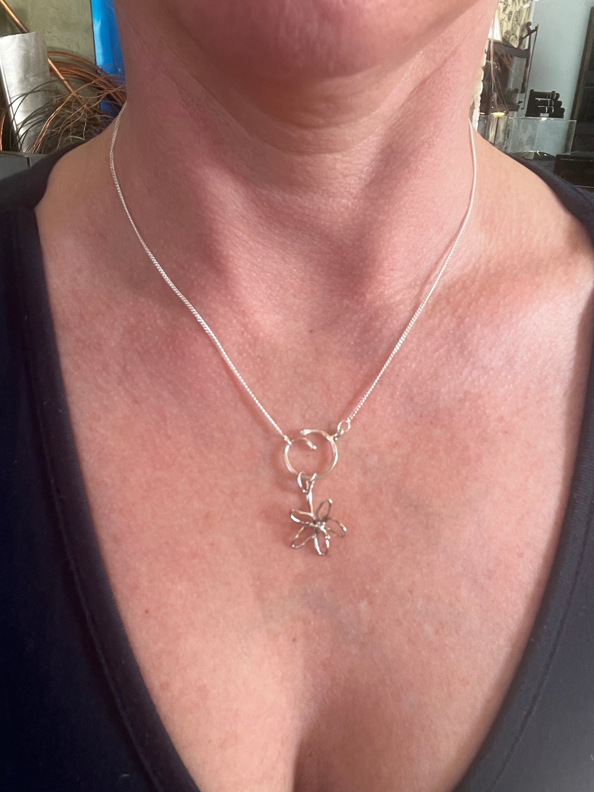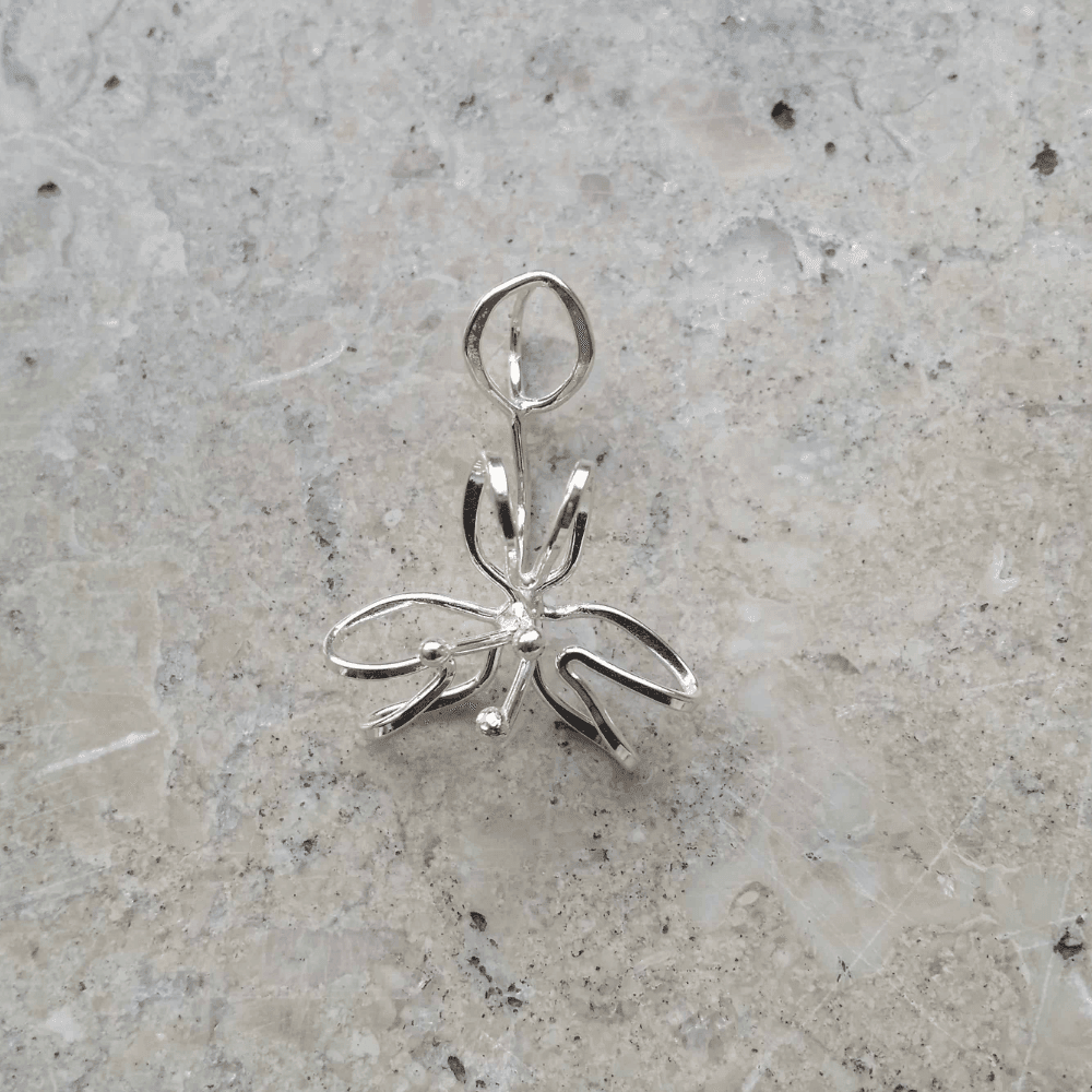 Organiskt formad blomma, handsmidd av en tråd i återvunnen ädelmetall för att förstärka känslan av att allt hänger samman. Blomman är symbolen för livskraft, och skönhet, men också förgänglighet. Denna blomma vill mjukt påminna dig om att vara i nuet, men kommer inte att vissna. Har du en speciell händelse blomman blir förknippad till, kommer den att påminna dig om den.