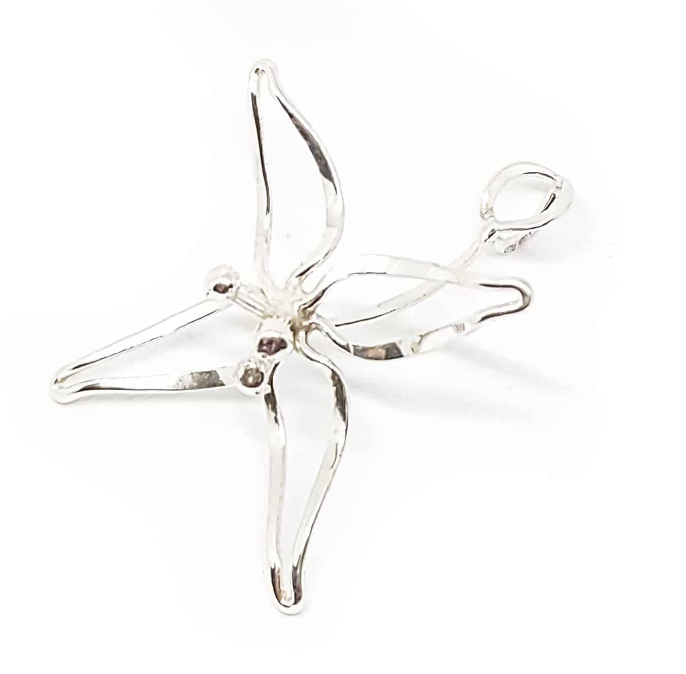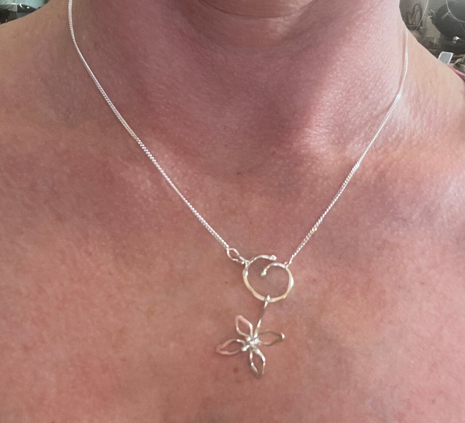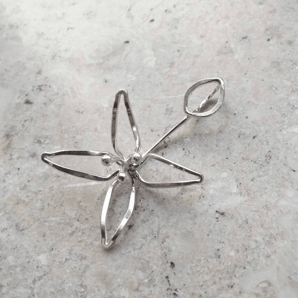 Organiskt formad blomma, handsmidd av en tråd i återvunnen ädelmetall för att förstärka känslan av att allt hänger samman. Blomman är symbolen för livskraft, och skönhet, men också förgänglighet. Denna blomma vill mjukt påminna dig om att vara i nuet, men kommer inte att vissna. Har du en speciell händelse blomman blir förknippad till, kommer den att påminna dig om den.