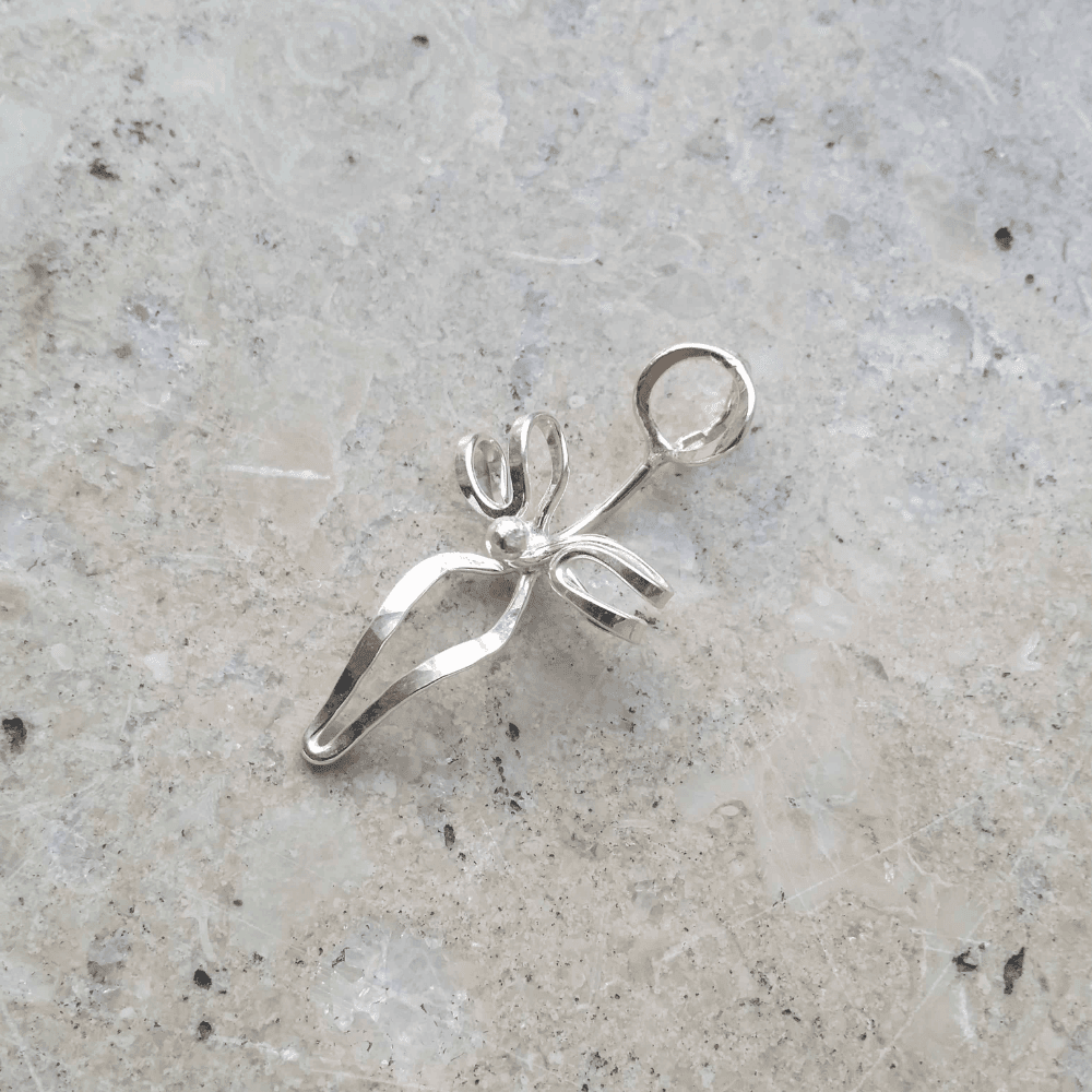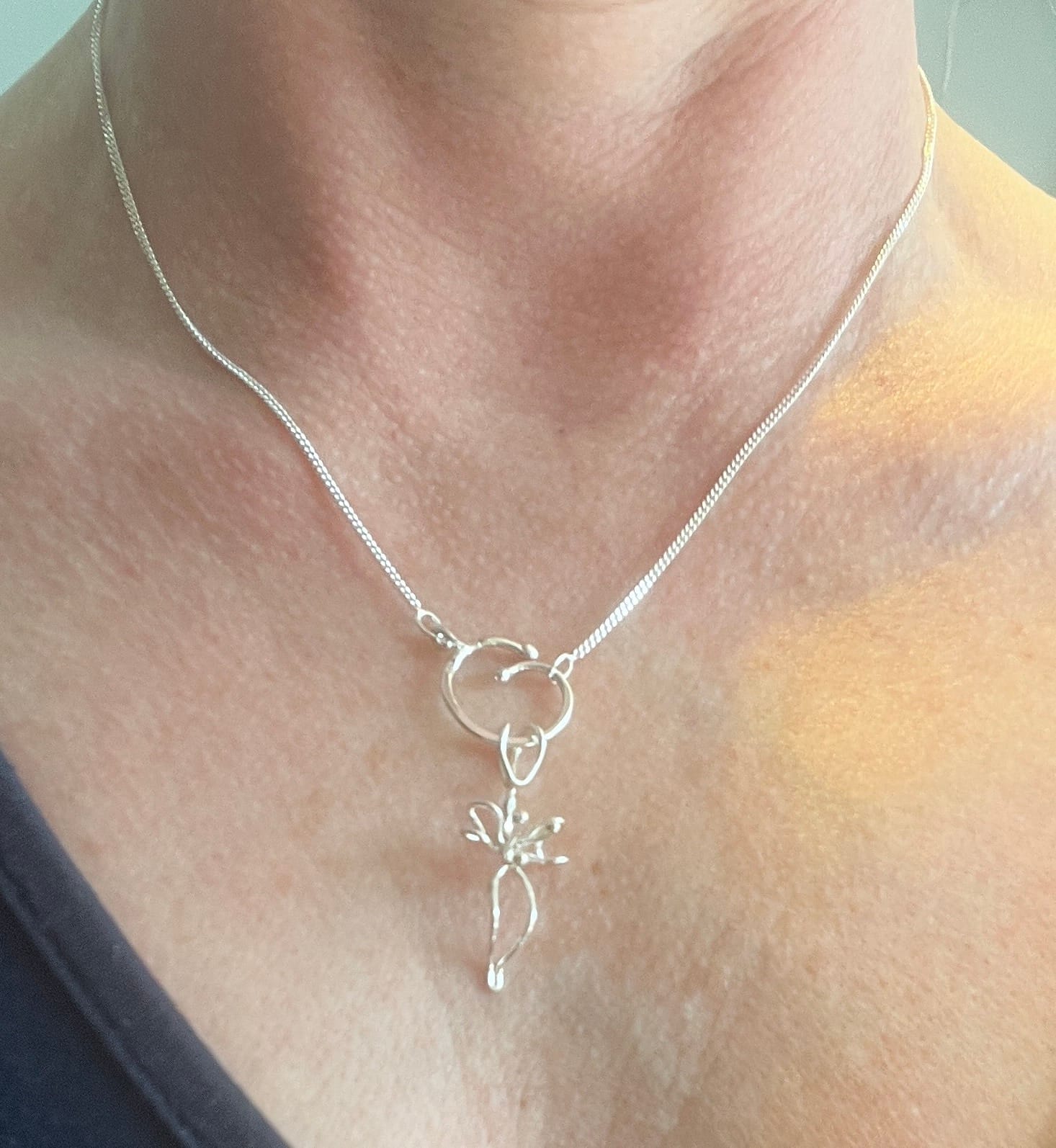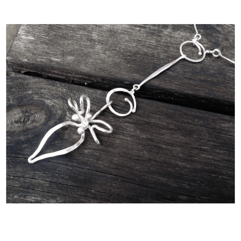 Organiskt formad blomma, handsmidd av en tråd i återvunnen ädelmetall för att förstärka känslan av att allt hänger samman. Blomman är symbolen för livskraft, och skönhet, men också förgänglighet. Denna blomma vill mjukt påminna dig om att vara i nuet, men kommer inte att vissna. Har du en speciell händelse blomman blir förknippad till, kommer den att påminna dig om den.