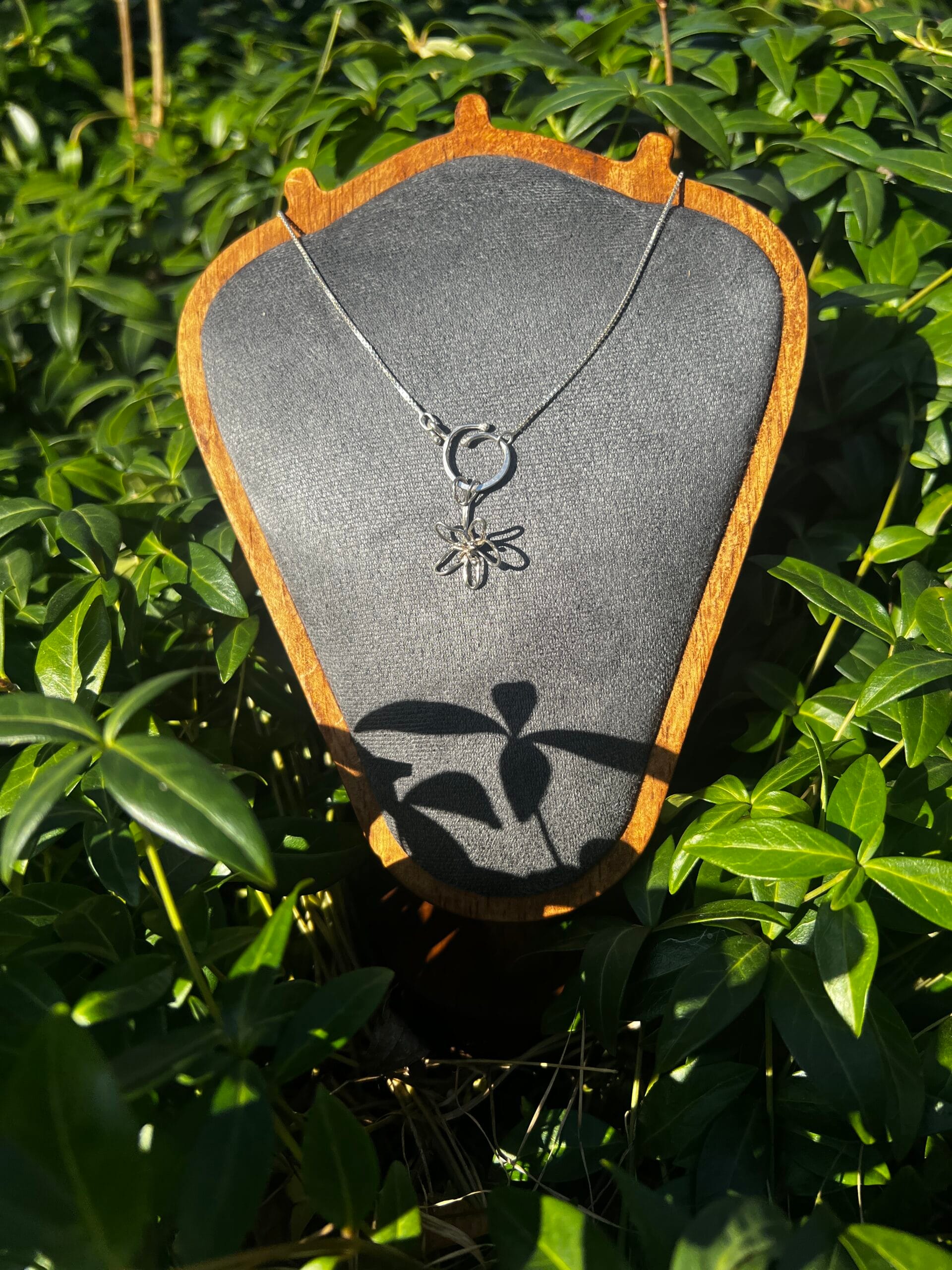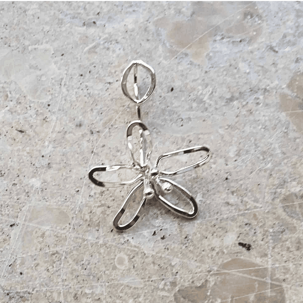 Organiskt formad blomma, handsmidd av en tråd i återvunnen ädelmetall för att förstärka känslan av att allt hänger samman. Blomman är symbolen för livskraft, och skönhet, men också förgänglighet. Denna blomma vill mjukt påminna dig om att vara i nuet, men kommer inte att vissna. Har du en speciell händelse blomman blir förknippad till, kommer den att påminna dig om den.