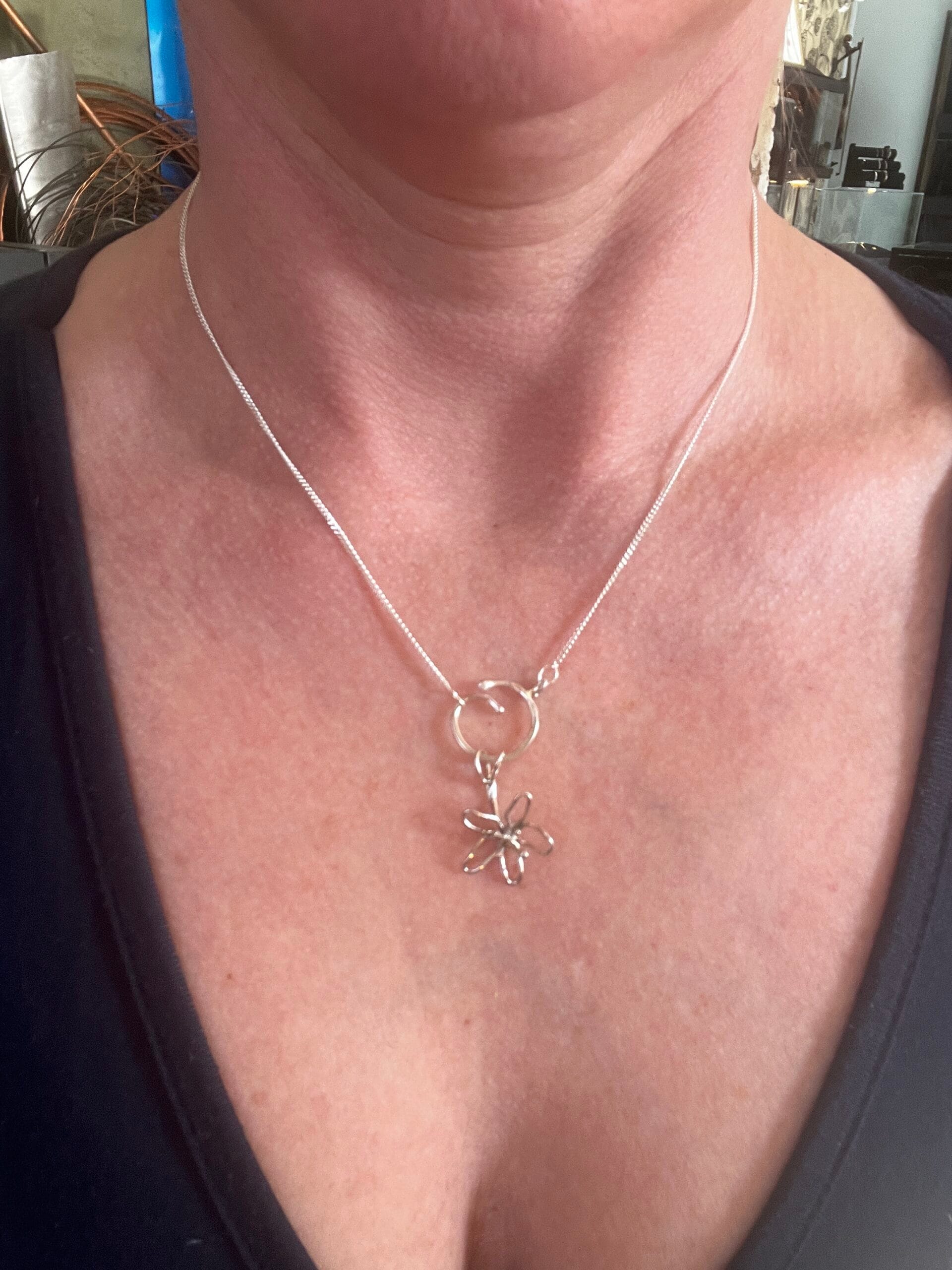 Organiskt formad blomma, handsmidd av en tråd i återvunnen ädelmetall för att förstärka känslan av att allt hänger samman. Blomman är symbolen för livskraft, och skönhet, men också förgänglighet. Denna blomma vill mjukt påminna dig om att vara i nuet, men kommer inte att vissna. Har du en speciell händelse blomman blir förknippad till, kommer den att påminna dig om den.